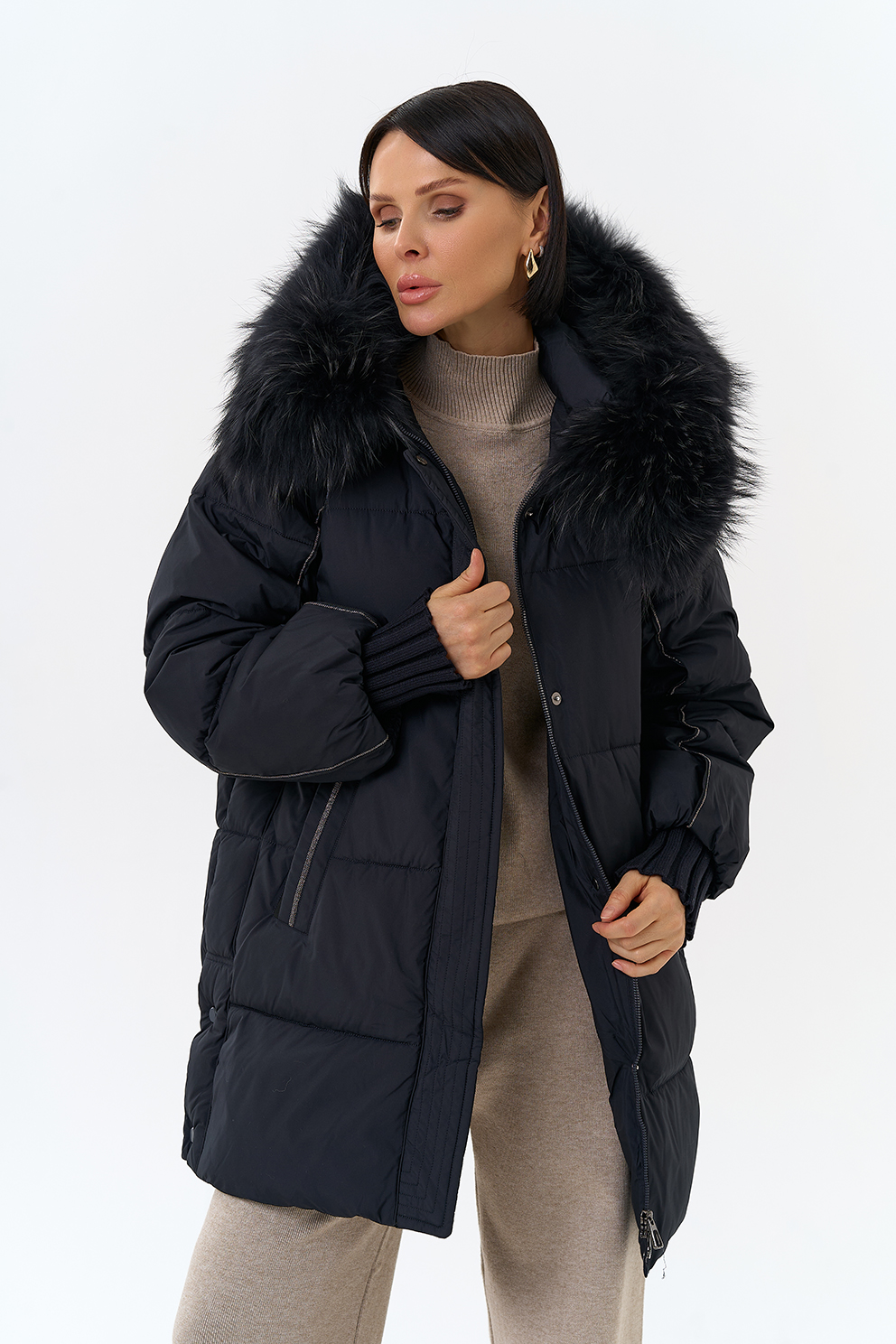 Крой воротника - капюшон, отделка енот