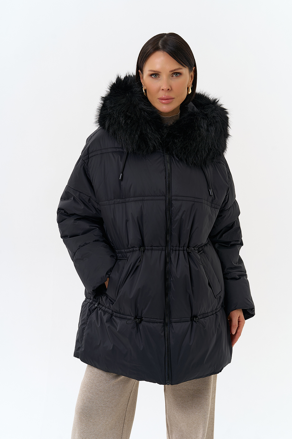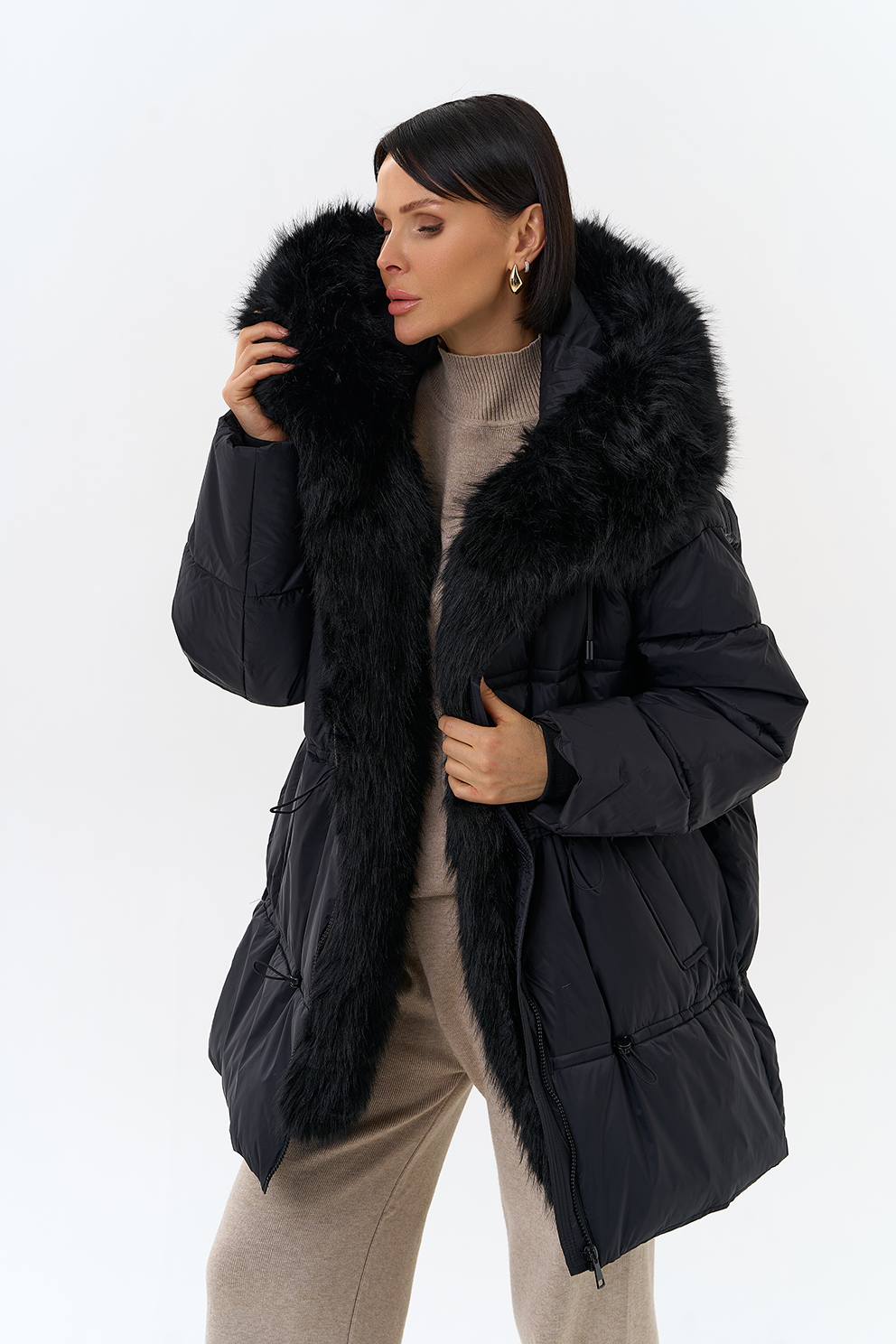 Крой воротника - капюшон, отделка искусственный мех