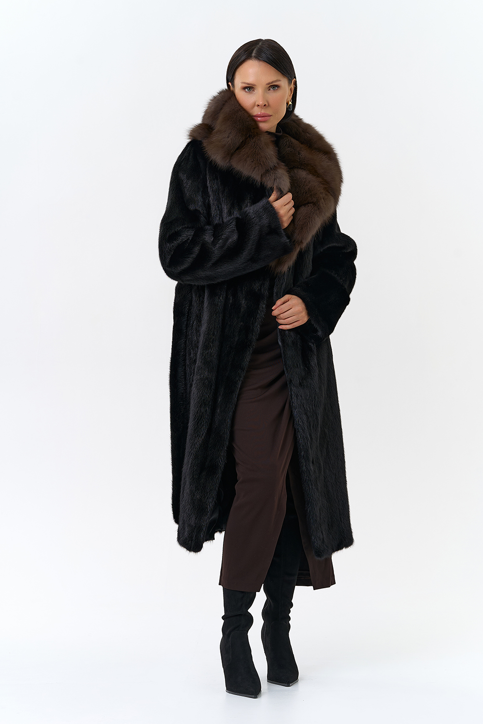 женщины. Капюшон выполнен с отделкой из куницы, что добавляет шубе роскоши.